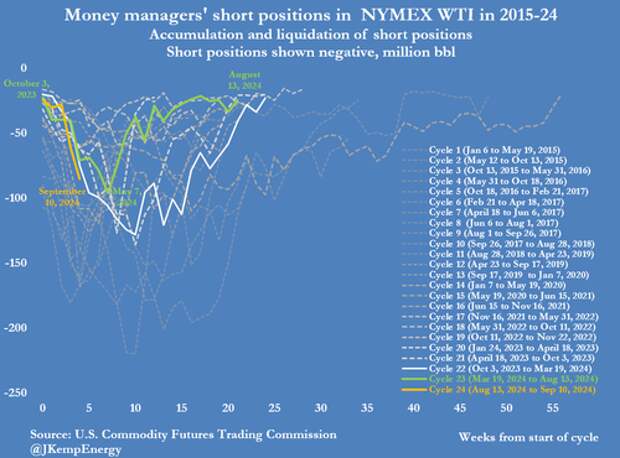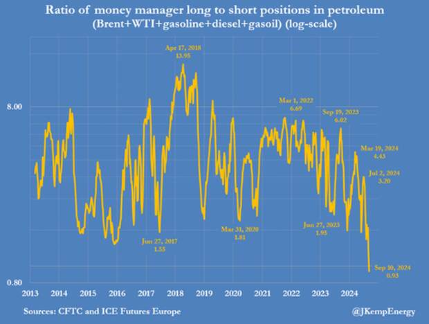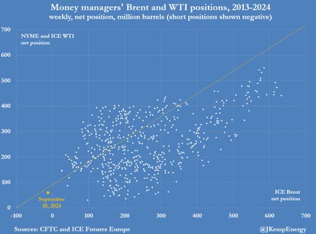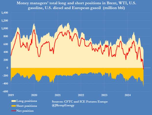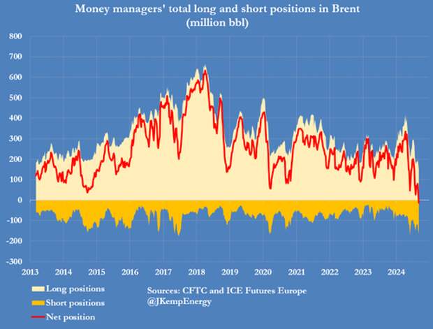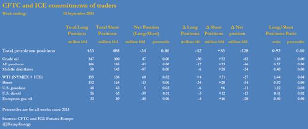 And for the first time on record, funds held a net short position of 34 million barrels down from a net long position of 524 million barrels on July 2.