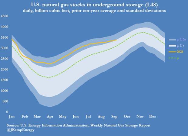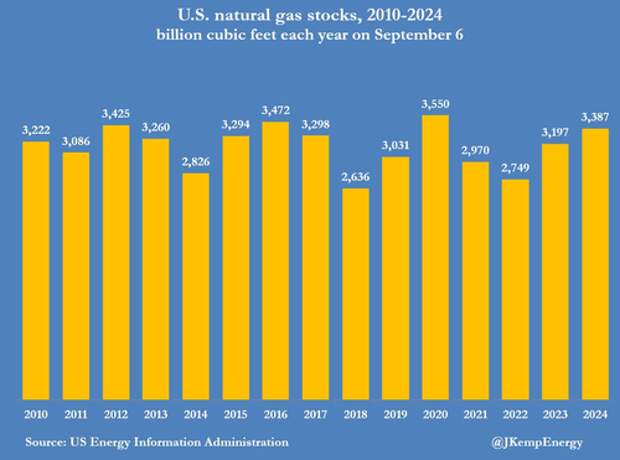 Working inventories increased by a total of just 188 bcf over the nine weeks ending on September 6, the smallest seasonal accumulation for more than a decade, and less than half the average of 441 bcf in the past ten years.