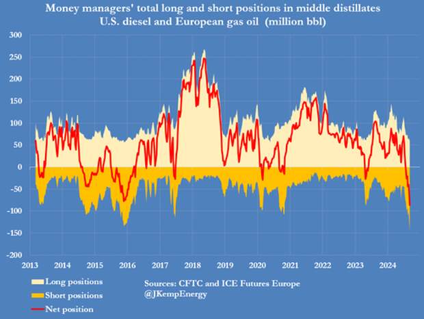Fund managers also held a record net short position of 48 million barrels in European gas oil and a near-record net short position of 39 million barrels in U.S. diesel.
