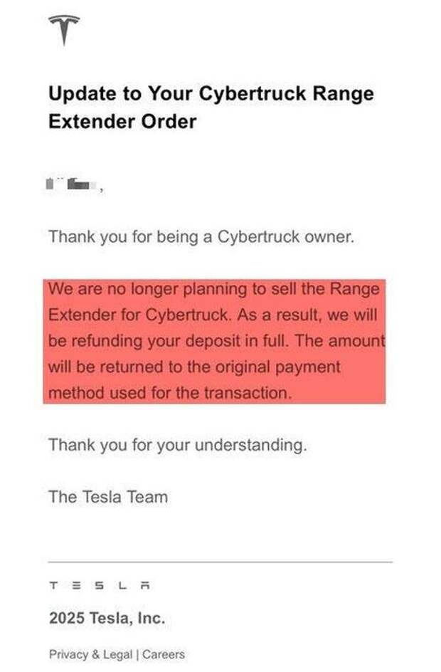 We are no longer planning to sell the Range Extender for Cybertruck. As a result, we will be refunding your deposit in full. The amount will be returned to the original payment method used for the transaction.