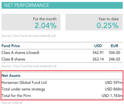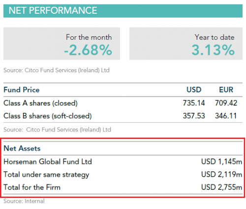 Needless to say, we wish Horseman much success with a prompt realization of his BBB-short, especially since it appears that his LPs are starting to get cold feet, and the fund's AUM has shrunk by half from $2.8 BN one year ago...