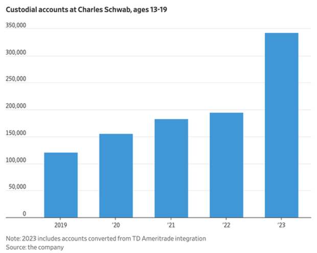 In a separate report, The Wall Street Journal said custodial accounts for teenagers at Schwab reached 200,000 in 2022, an increase from around 120,000 in 2019. This number soared past 300,000 in 2023, partly due to Schwab's acquisition of TD Ameritrade.