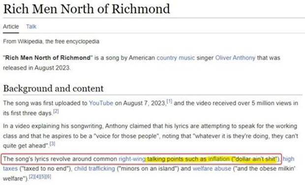 Wikipedia’s since edited page on "Rich Men North of Richmond" initially Twitter