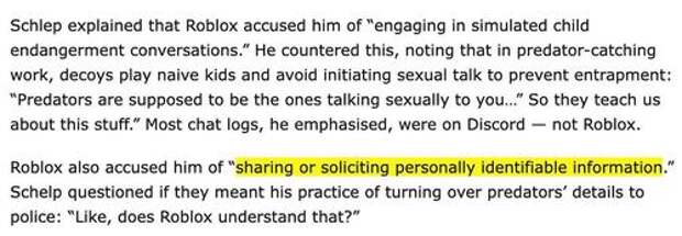 Schlep was gobsmacked and wondered if Roblox was referring to the practice of turning over the information of predators to police. “Like, does Roblox understand that?” he asked.
