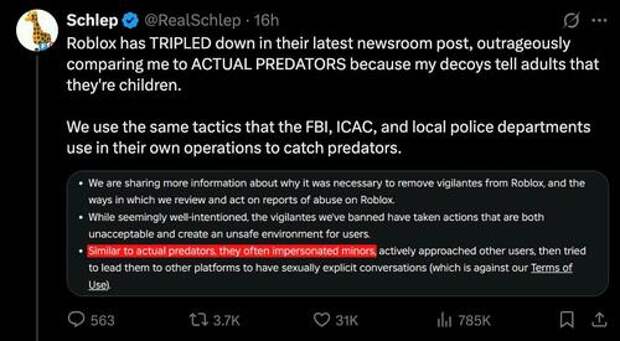 “History has proven again and again [that] it’s infinitely easier for corporations to silence and censor whistleblowers than actually work on fixing whatever issue they’re bringing attention to. Roblox doesn’t have a child predator issue if no one’s able to report on it. The fact [that] his [Schlep’s] investigations led to six actual arrests made by the police acting on outside evidence is proof enough his efforts aren’t misguided.”