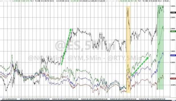 Stocks went vertical, gold soared, Treasury yields plunged (and the yield curve steepened... in a good way), oil ramped up too (and so did crypto, even after the week it had).