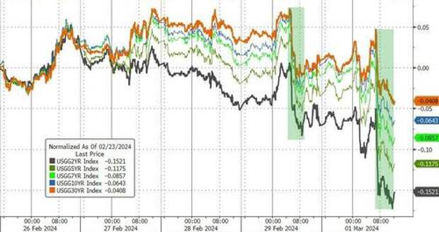 Bonds were aggressively bid today, led by the short-end (2Y -9bps, 30Y -5bps), dragging all yields lower on the week (again led by the short-end)...