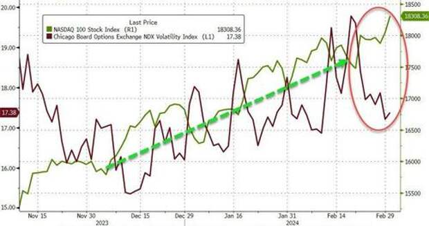 Interestingly, while the last few months have seen 'Vol Up, Spot Up' in Nasdaq as traders chase the market with levered bets, the last week has seen vols decline as stocks soared (implying less of a FOMO chasefest)...