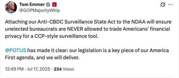 Emmer reintroduced a version of the bill in the current Congress, and Republicans have backed the effort as aligning with President Donald Trump’s executive order in January prohibiting CBDCs.