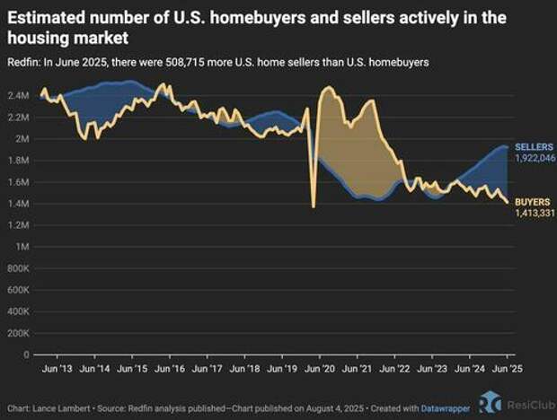 Lance Lambert, co-founder and editor of ResiClub, posted on X, highlighting an ongoing and record-breaking trend in the housing market: sellers now outnumber buyers by the widest margin since Redfin data began well over a decade ago.