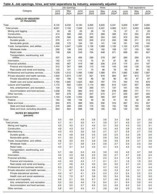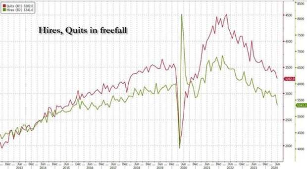 But wait there's more: confirming that if one ignores the clearly manipulated jump in government job openings ("quick, let's hire a ton more TSA agents and deep state apparatchiks to make it seems that Kamalanomics is working"), a quick look at the number of quits - an indicator closely associated with labor market strength as it shows workers are confident they can find a better wage elsewhere - showed a plunge in June, dropping by 121K, the most since July 2023, to just 3.282 million, the lowest since August 2020!