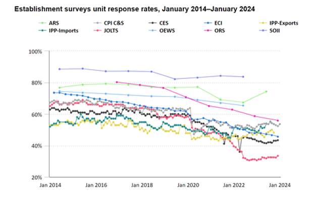 Finally, no matter what the "data" shows, let's not forget that it is all just estimated, and it is safe to say that the real number of job openings remains still far lower since half of it - or some 70% to be specific - is guesswork. As the BLS itself admits, while the response rate to most of its various labor (and other) surveys has collapsed in recent years, nothing is as bad as the JOLTS report where the actual response rate remains near a record low 33%