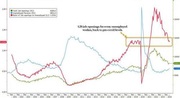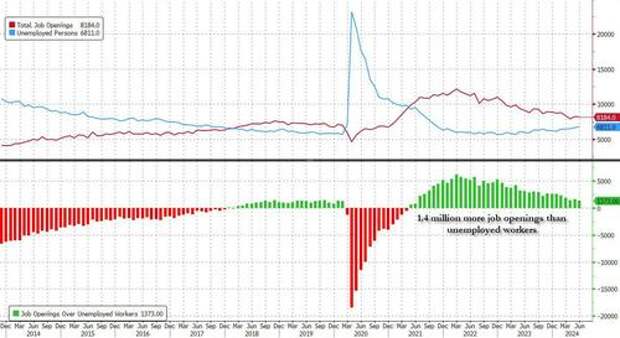 Ignoring the data manipulation, in the context of the broader jobs report, in June the number of job openings was 1.373 million more than the number of unemployed workers (which the BLS reported was 6.811 million), down from last month's 1.581 million and the lowest since the summer of 2021.