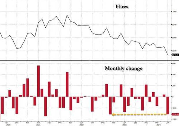 Finally, the piece de resistance was the number of actual hires, which in June also tumbled to just 5341, down a massive 314K in one month, the biggest monthly drop since February 2023...