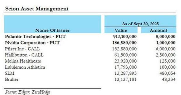 Days after Burry's bubble post on X, his Scion Asset Management 13F revealed that roughly 80% of his put positions were concentrated in the high-flyers Palantir and Nvidia.