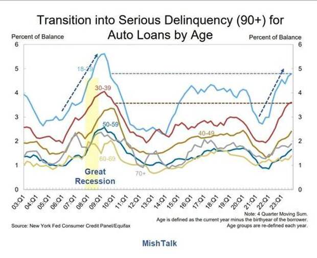 Serious delinquencies on auto loans have jumped from under 3 percent in mid-2021 to to 5 percent at the end of 2023 for age group 18-29.