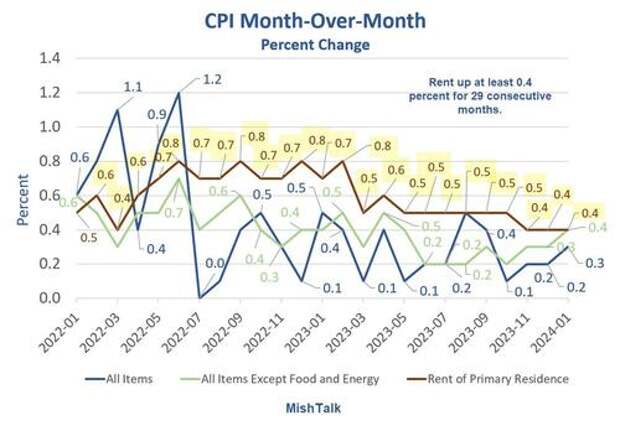 According to the latest CPI report, rent was up at least 0.4 percent for the 29th straight month. Shelter, a broader category, rose 0.6 percent. Food rose 0.4 percent.