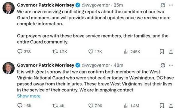 Update: The West Virginia governor has issued a strange backtrack after minutes prior announcing the guard members who were shot were "confirmed dead". He now cites "conflicting reports" of their condition.