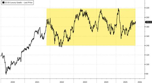 In markets, the Goldman Luxury European Index (GSXELUXG), a sell-side benchmark tracking luxury heavyweights including LVMH, Hermès, Richemont, Burberry, Ferrari, and others, has traded largely sideways since 2022.
