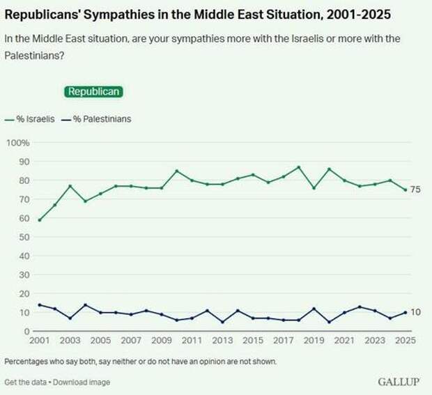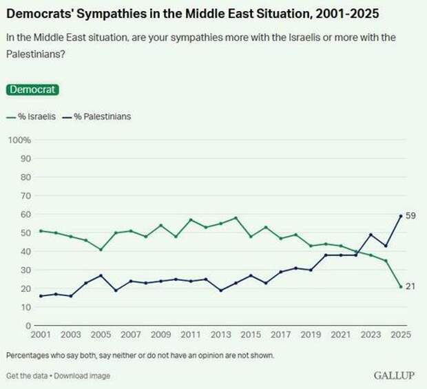 Democrats also sided with the Israelis until 2022, when roughly equal shares said they sympathized with each side. Since then, Democrats have supported the Palestinians.