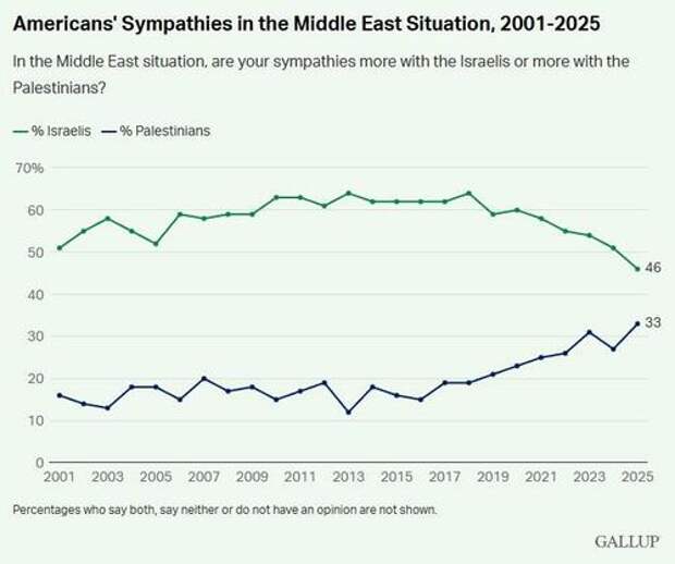 At the same time, the 33% of U.S. adults who now say they sympathize with the Palestinians is up six percentage points from last year and the highest reading by two points.