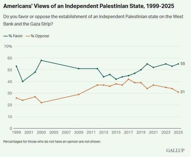 For years, a core tenet of Middle East peace proposals has been the so-called “two-state solution,” which would entail the creation of a Palestinian state. Gallup has measured Americans’ views on this since 1999. Since then, more Americans have supported than opposed the establishment of an independent Palestinian state in the West Bank and the Gaza Strip, and that continues today. Currently, 55% are in favor and 31% opposed, while 14% do not have an opinion.