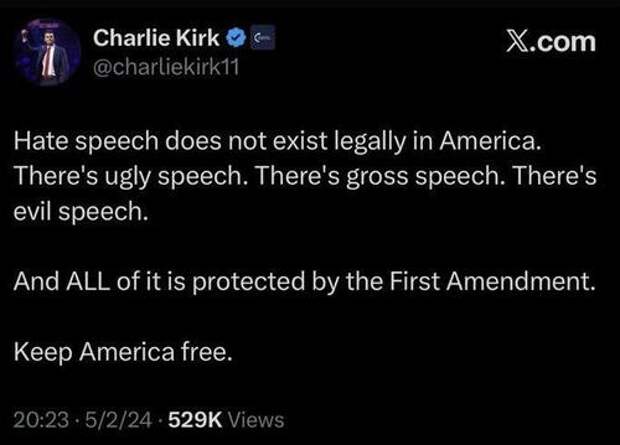 As Walsh elsewhere explained, "There should be social consequences for people who openly celebrate the murder of an innocent man. But there obviously shouldn’t be any legal repercussions for 'hate speech,' which is not even a valid or coherent concept. There is no law against saying hateful things, and there shouldn’t be."