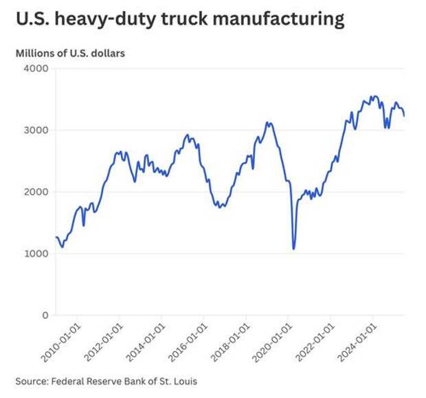 “Without something like that, the input tariffs will continue to be a drag on manufacturing,” he noted, pointing to earlier “tariff offsets” granted for cars and light trucks.Mexico is the largest supplier of medium- and heavy-duty trucks to the U.S., followed by Canada, Japan, Germany, and Turkey. Heavy-truck shipments from U.S. plants climbed from a low of $1.1 billion in April 2020 to $3.2 billion this July, though they have dipped modestly this year, Federal Reserve data shows.