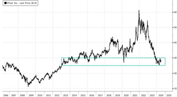 "In markets, shares of Pfizer are up 3% to around the $29 handle. Shares have been halved in recent years, falling to early 2013 lows, following the end of the virus pandemic that sent Covid vaccine demand plunging.