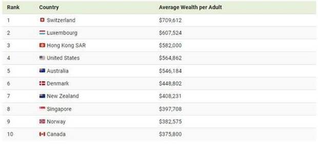Switzerland ranks first overall, with average wealth per adult increasing from $685,226 in 2022 to $709,612 in 2023.