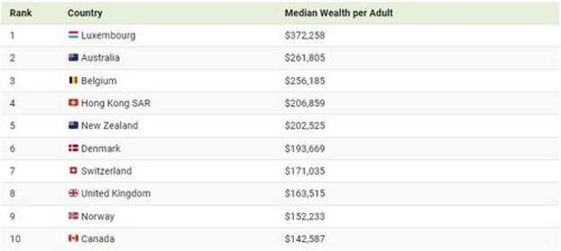 Moreover, Australia and Belgium rise up the ranks, with Belgium seeing a particularly small gap between average and median wealth. Part of this is attributed to high real estate ownership in Belgium, where 10% of the population own more than one home.