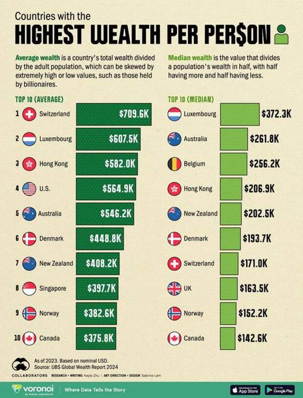 This graphic, via Visual Capitalist's Kayla Zhu, shows the top 10 countries by average and median wealth, based on data from UBS.