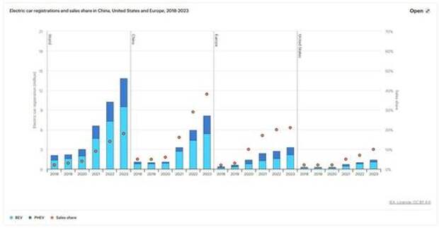 The key to China's success has been managing cost, the IEA report notes: "In China, we estimate that more than 60% of electric cars sold in 2023 were already cheaper than their average combustion engine equivalent."