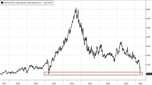 The immediate consequence of the significant testing policy shift sent shares of Charles River, the leading provider of research animal models, plunging by a one-day record of 28%, reaching their lowest level since March 2020 by Thursday's close.
