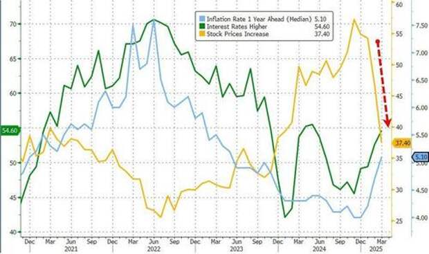 In March, only 37.4% expected stock prices to rise over the year ahead - down nearly 10 percentage points from February and 20 percentage points from the high reached in November 2024. On the flip side, 44.5% expected stock prices to decline (up 11 ppts from February and over 22 ppts more than November 2024).