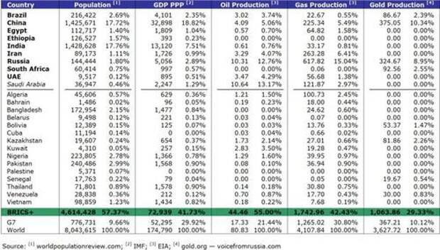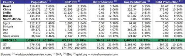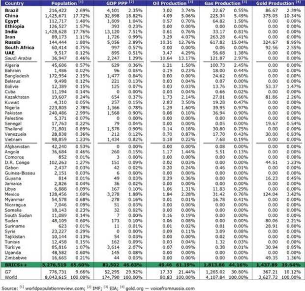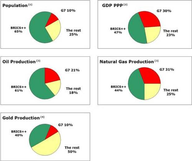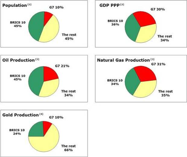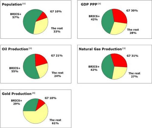 In our figures, we compare the BRICS-10 with the G7 and the world as a whole to give you a feel for the ratios. The parameters we use are population, GDP (adjusted for purchasing power), oil production, gas production and gold production.