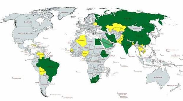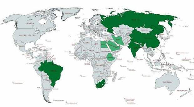 Green: BRICS 10 – Yellow: formal requests for membership – Blue: countries that show interest