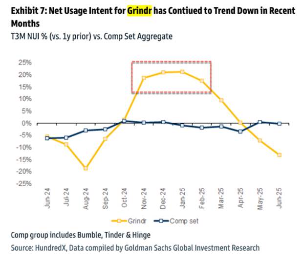 "Grindr user trends have continued to slow in recent months," analysts Eric Sheridan and Julia Fein-Ashley wrote in a note to clients on Tuesday.