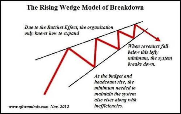 I call this the Rising Wedge Model of Breakdown: as expenses, self-interest and debt all expand, it becomes increasingly difficult to slash expenses without triggering the implosion of the organization.