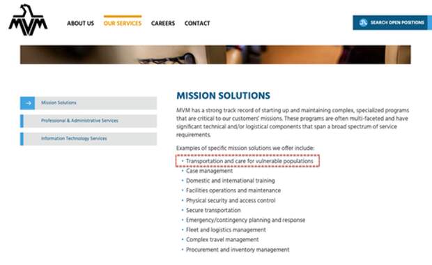 Their website reveals their 'Mission Solutions,' which include "Transportation and care for vulnerable populations [migrants]."