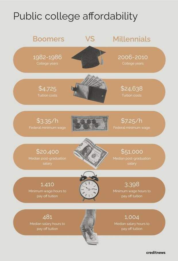 Creditnews Research put that theory to the test by comparing the college tuition costs of Baby Boomers and Millennials against what both generations earned after graduation.