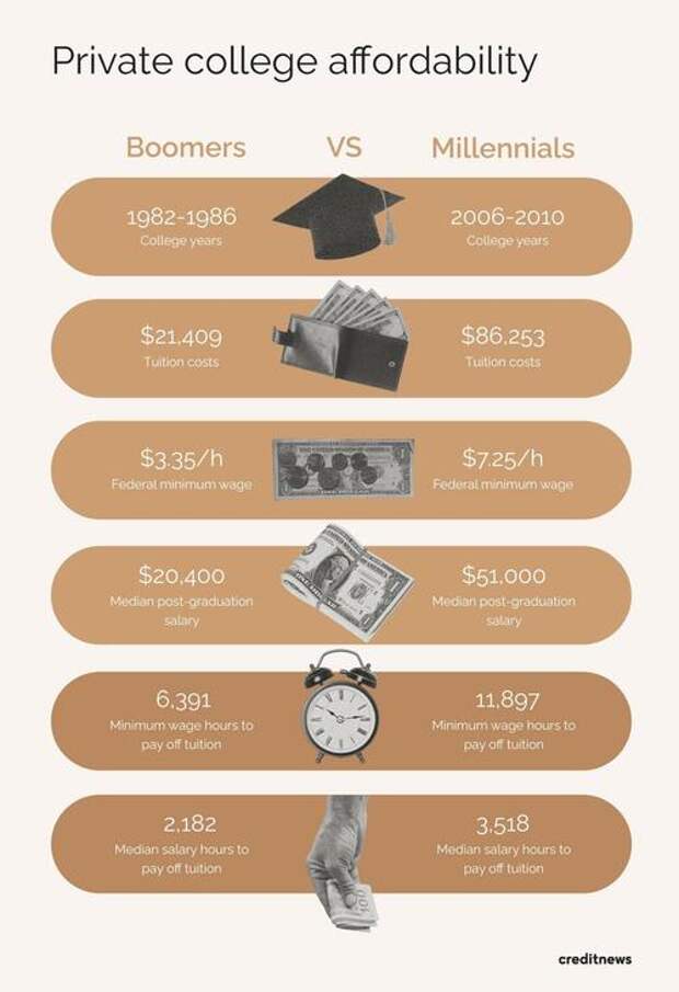 When attending private colleges, Millennials need to work five times as many hours as Baby Boomers to pay down their tuition if they earn minimum wage;