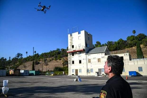 Drones are deployed during a demonstration at the Los Angeles Fire Department ahead of DJI's AirWorks conference in Los Angeles on Sept. 23, 2019. Drones are proving to be a game changer for emergency responders who are increasingly using the technology to spot fires, detect toxic gas, or to locate missing people or suspects, experts say. Robyn Beck/AFP via Getty Images