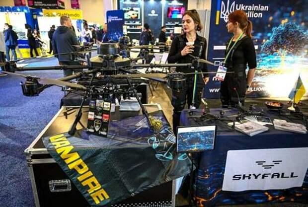 The Skyfall Vampire drone and SHRIKE FPV drone from Ukraine are displayed in the Ukrainian technology pavilion at the Consumer Electronics Show in Las Vegas on Jan. 7, 2025. Patrick T. Fallon/AFP via Getty Images