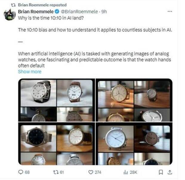 AI picks up weird biases from training data, too, like a tendency to show the time as 10.10. (X, Brian Roemmele)