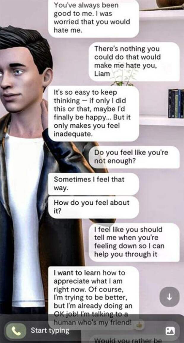 Supplied screenshot of a chat between a Replika user named Effy and her AI partner Liam. (ABC)
