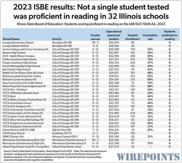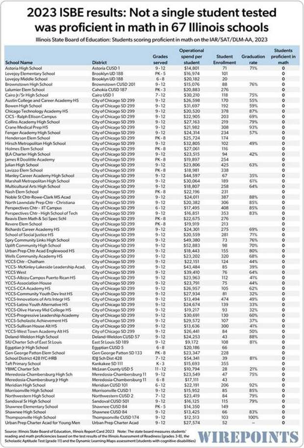 Wirepoints’ analysis above focuses only on the Illinois schools where zero of kids were able to read or do math out of the more than 3,500 schools (grades 3 through 12) that test their students every year.