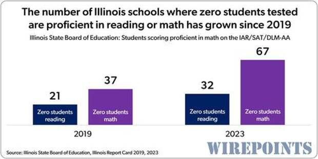 Pre-covid, there were 21 zero-reading schools and 37 zero-math schools in Illinois. In 2023, that grew to 32 and 67, respectively.