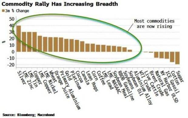 Commodities are on the march though. Indices such as Bloomberg’s Commodity index are close to breaking out of their 12-month ranges, while Bloomberg’s Spot Commodity Index, which does not include the cost of rolling future positions has already broken out.