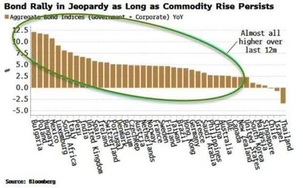 Aggregate bond indices are up in most countries on an annual basis. But the broadening commodity rally threatens to feed into global inflation and kickstart another bond selloff.